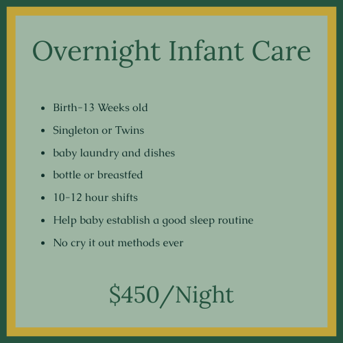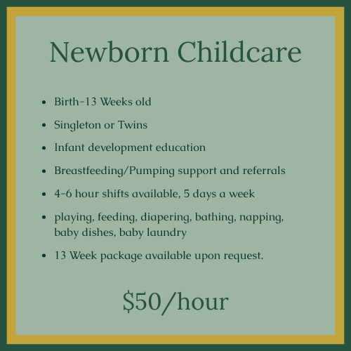 If you need more than a couple hours of childcare a day. I offer child centered daytime and overnight infant care separate from my postpartum services. During these shifts I am focused on infant care and development. Chores are reduced to baby laundry and bottles. As I focus on feeding, diapering, napping and playing with your baby.